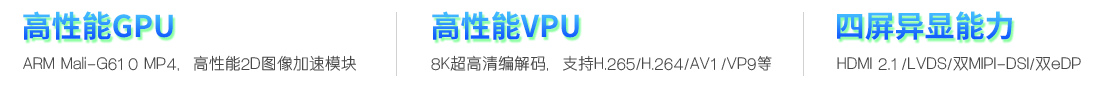 CPU:四核Cortex-A76 + 四核Cortex-A55@2.4GHz NPU:6TOPS,三核架構(gòu),支持INT4/INT8/INT16/FP16混合操作 GPU:ARM Mali-G610 MP4;OpenGL ES 1.1, 2.0, 3.1,3.2、Vulkan 1.1,1.2、OpenCL1.1,1.2, 2.0;內(nèi)嵌高性能2D圖像加速模塊 VPU: ??解碼:H.265、H.264、AV1、VP9、AVS2:up to 8K@60fps ??編碼:H.264、H.265:up to 8K@30fps |